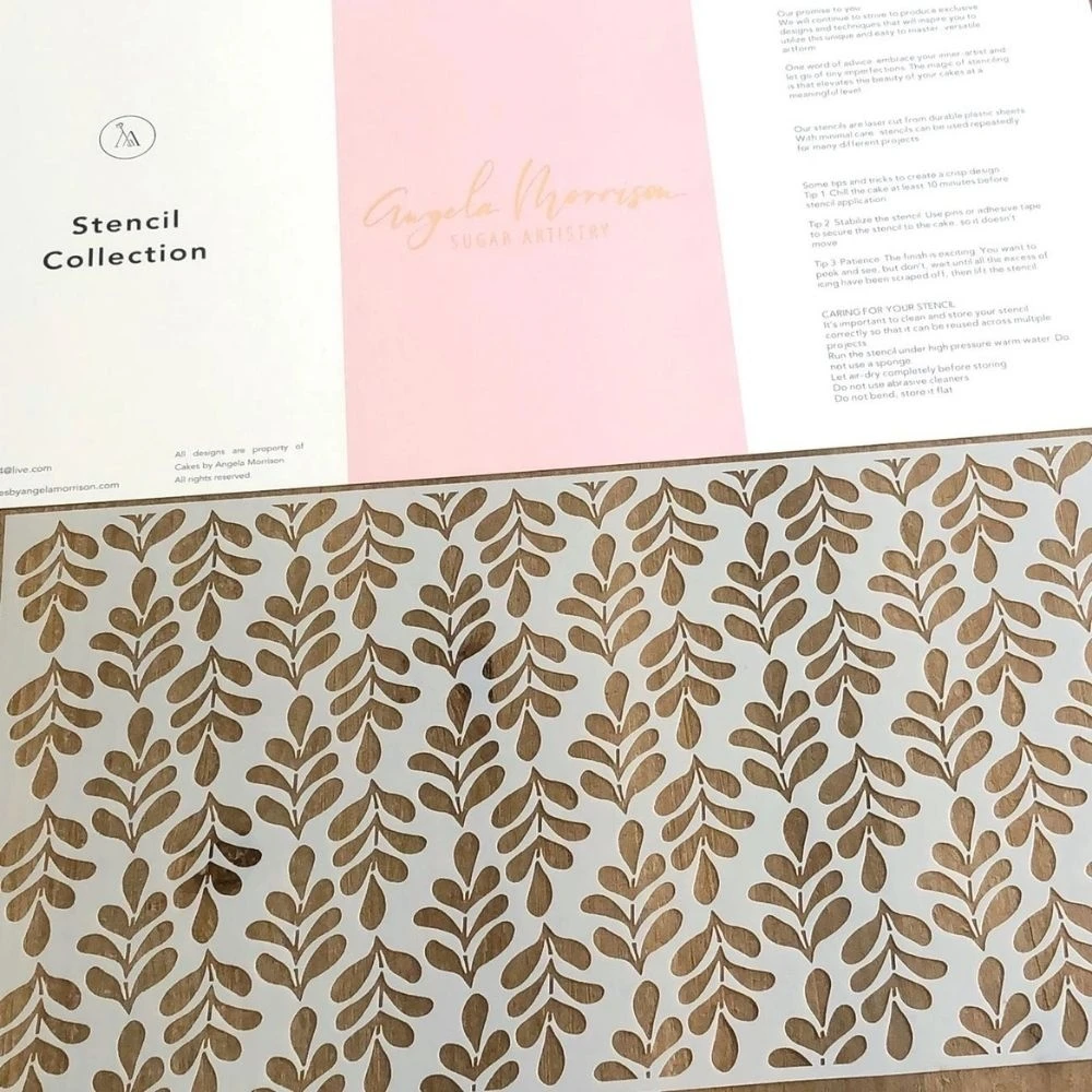 Add texture, layer colours, or add background patterns to your cake tiers with Angela Morrisonโs stencil designs.