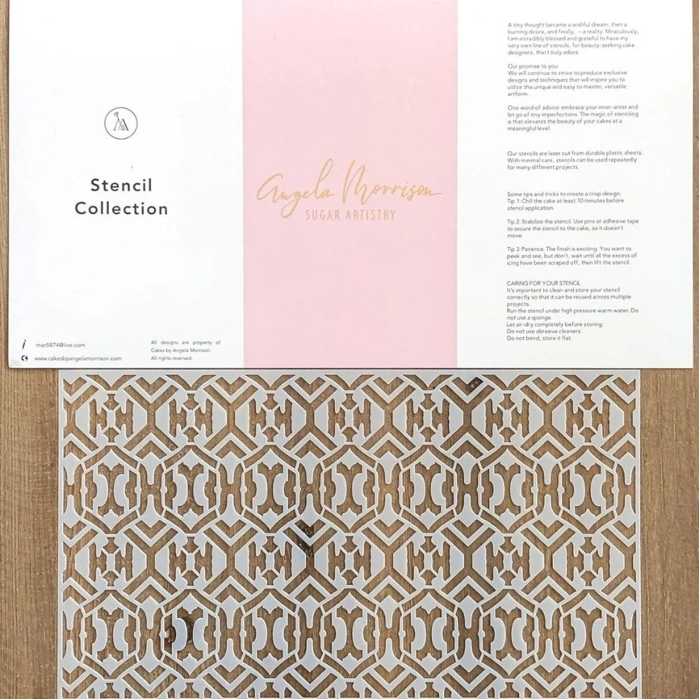 Angela Morrison’s extensive stencil collection lets you create beautifully elegant designs on your cake tiers, perfect for an array of occasions and themes, including weddings, birthdays, anniversaries, engagement celebrations and many more.