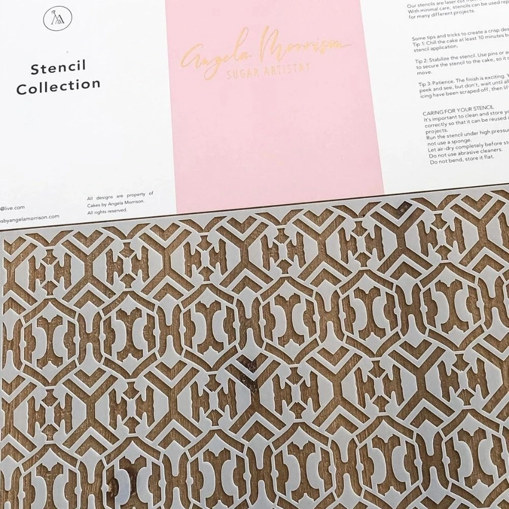 Add texture, layer colours, or add background patterns to your cake tiers with Angela Morrisonโs stencil designs.