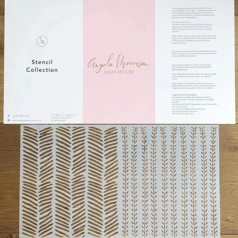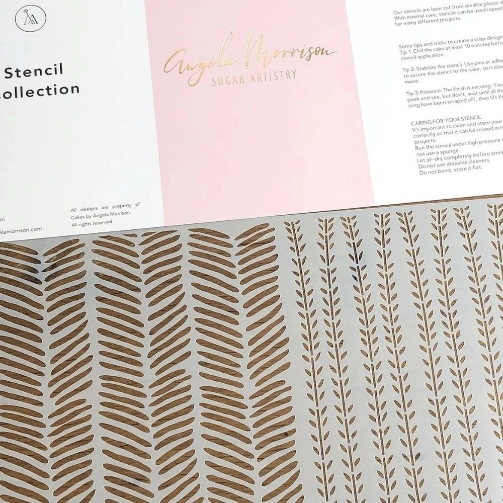 Angela Morrison’s extensive stencil collection lets you create beautifully elegant designs on your cake tiers, perfect for an array of occasions and themes, including weddings, birthdays, anniversaries, engagement celebrations and many more.