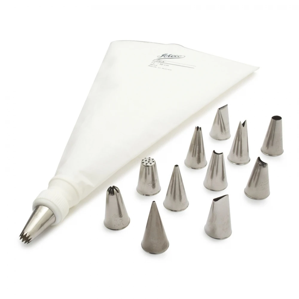 It contains a 12 inch reusable flex piping bag with hem and hanging loop, and 12 stainless steel decorating tubes. It also includes a plastic coupler (pre-attached to bag), instructions, recipes, and a clear plastic storage box.