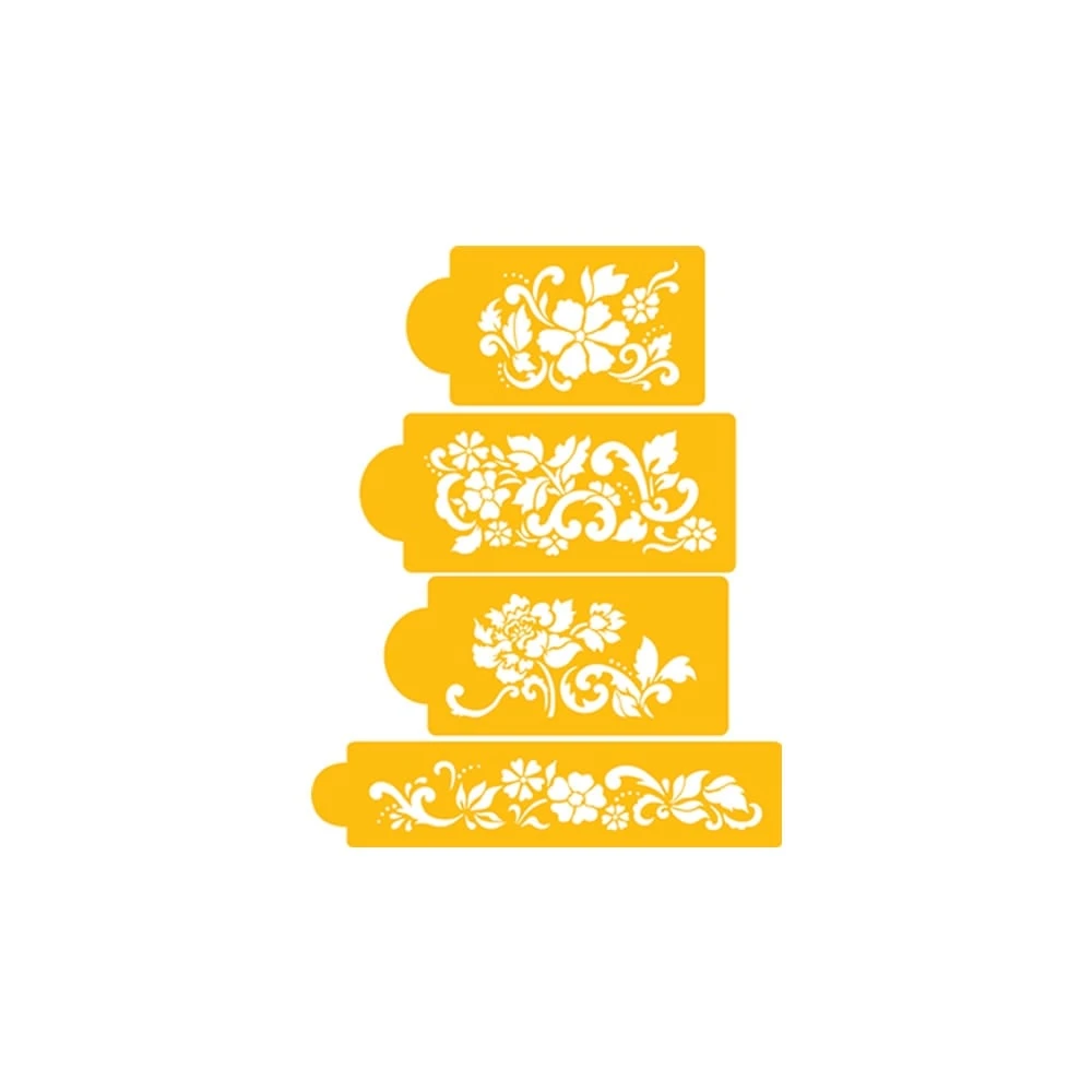 This beautiful floral cake stencil set consists of four patterns. The stencil is cut out of a durable, 10mil food-grade plastic.