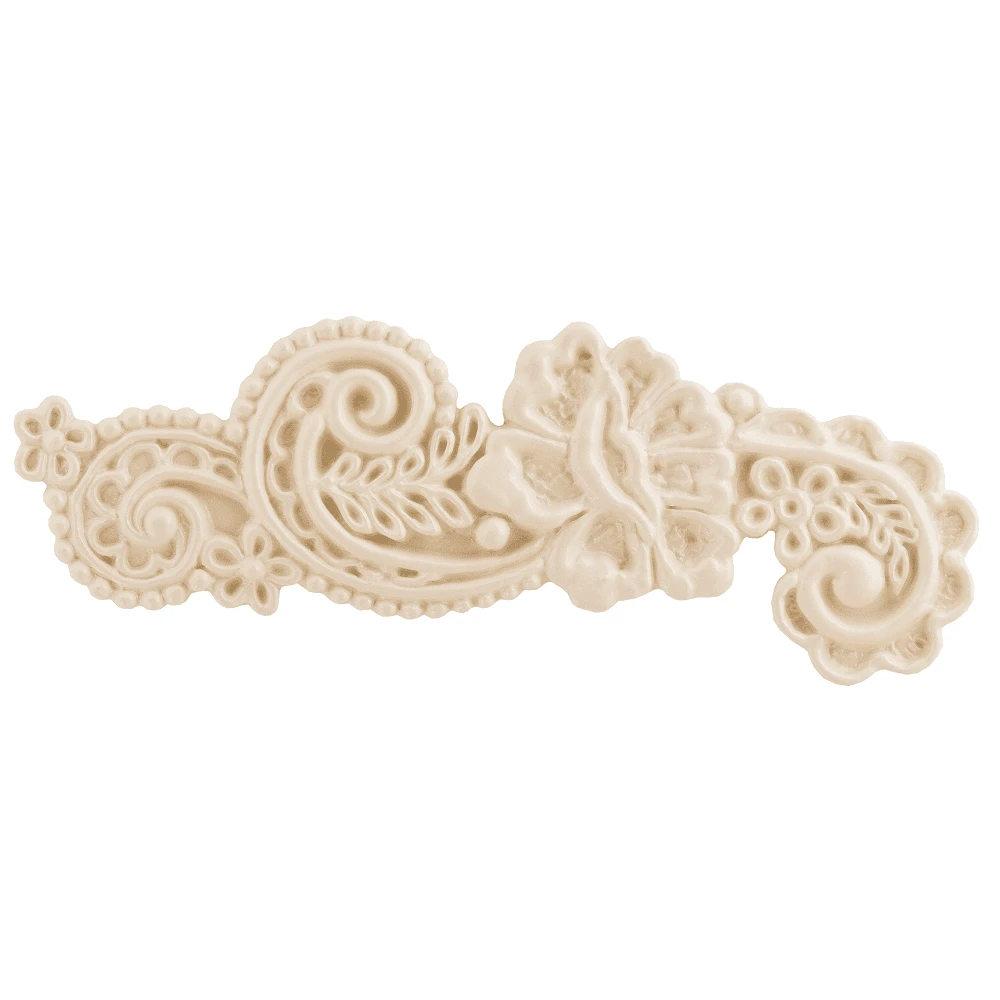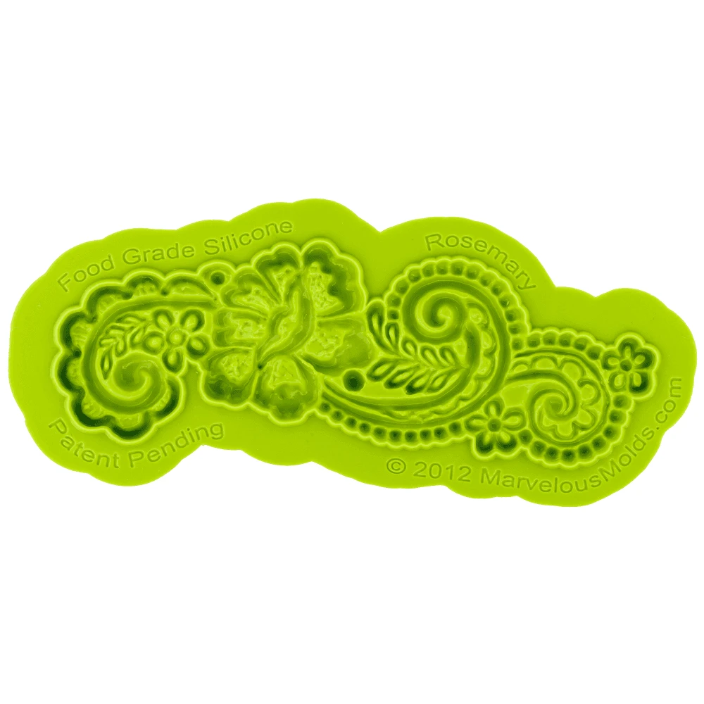 Rose Mary is a Silicone Lace Mold with a self trimming blade and an enhanced lace pattern that has a lace flower with a scroll accent on one side, and a dual scroll on the other.