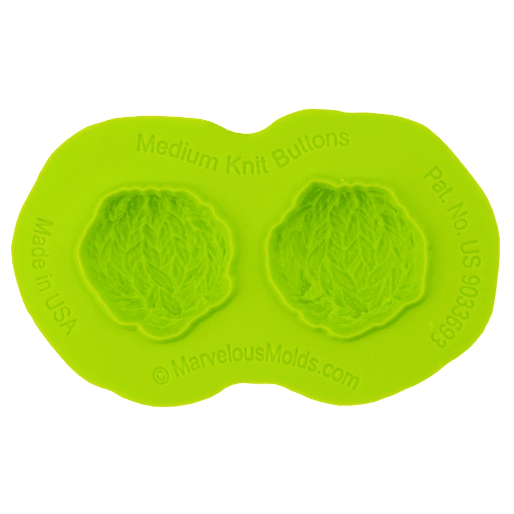 Created in collaboration by Anne Heap and Marvelous Molds the Medium Button Mould has 2 buttons with a knit texture suitable for a range of different cake designs, clothing for cake toppers or even as a single cupcake topper.