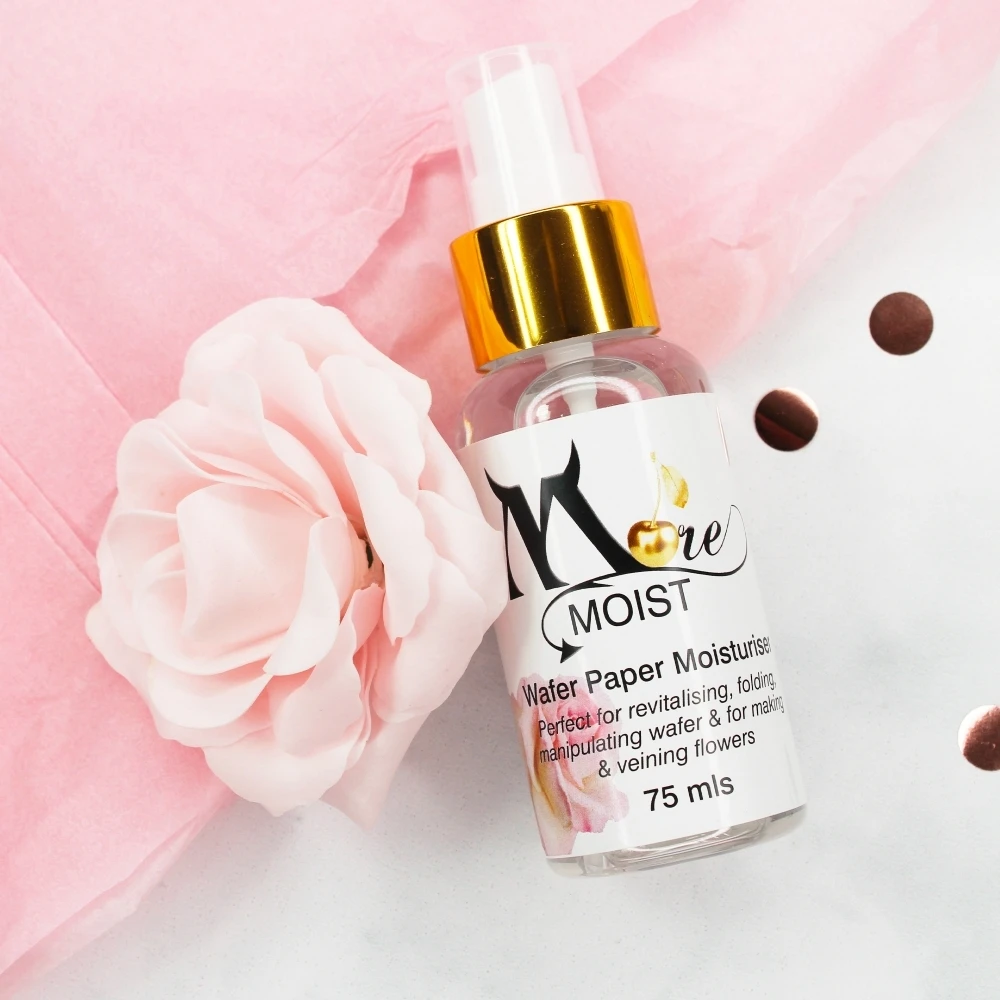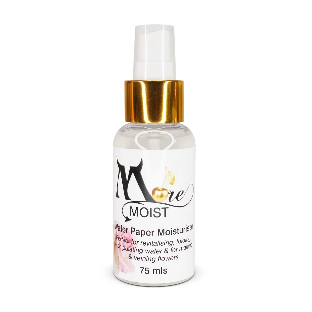 โMore Moistโ has been developed by Monica Cavallaro, letting you revitalise your wafer paper. The More Moist spray will allow you to bend, fold, and manipulate your wafer paper in ways that are not possible with straight-up sheets from the pack.