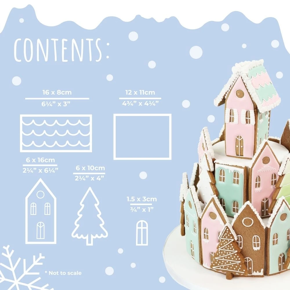 This set includes 5 cutters, including a wall cutter, window cutter, roof cutter and fir tree cutter. Everything you need to create the most beautiful festive gingerbread house!