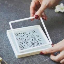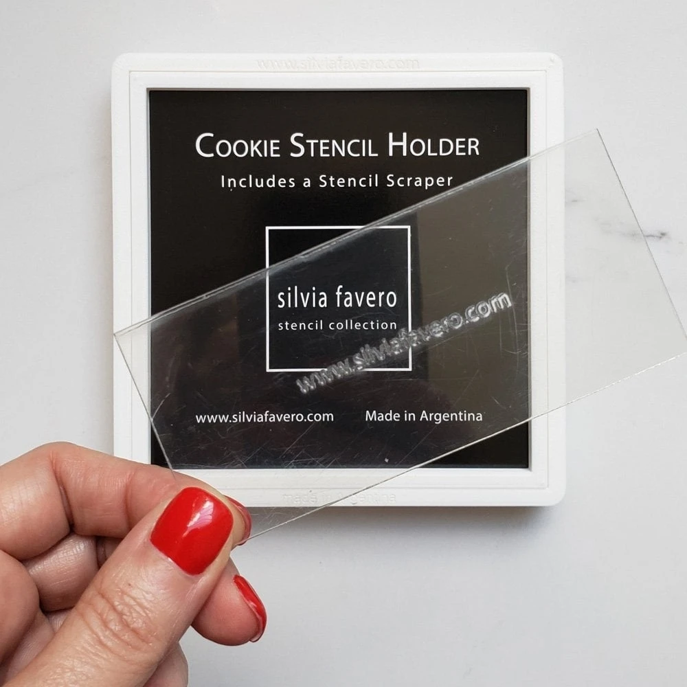 The cookie stencil holder and the scraper has been designed for use with Silvia Favero’s Cookie Stencil Collection, and is perfect for keeping your stencils and cookies in place while decorating.