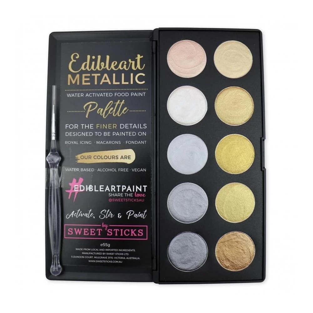 Edible Art Metallic Water Activate Food Paint Palette by Sweet Sticks is the first of its kind. Specifically designed to assist for the finer details in cake and cookie decorating. And, with a unique blend of 100% edible ingredients they can paint, dry and be rub free on many surfaces making decorating quicker, easier and more effective.