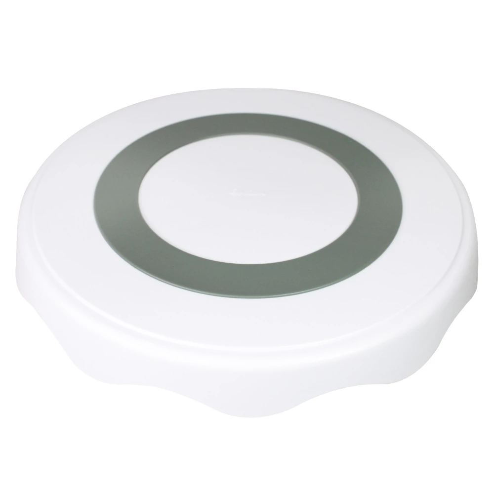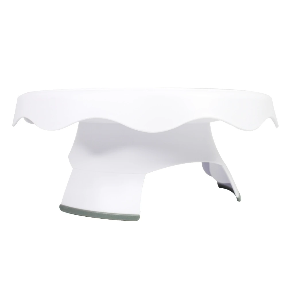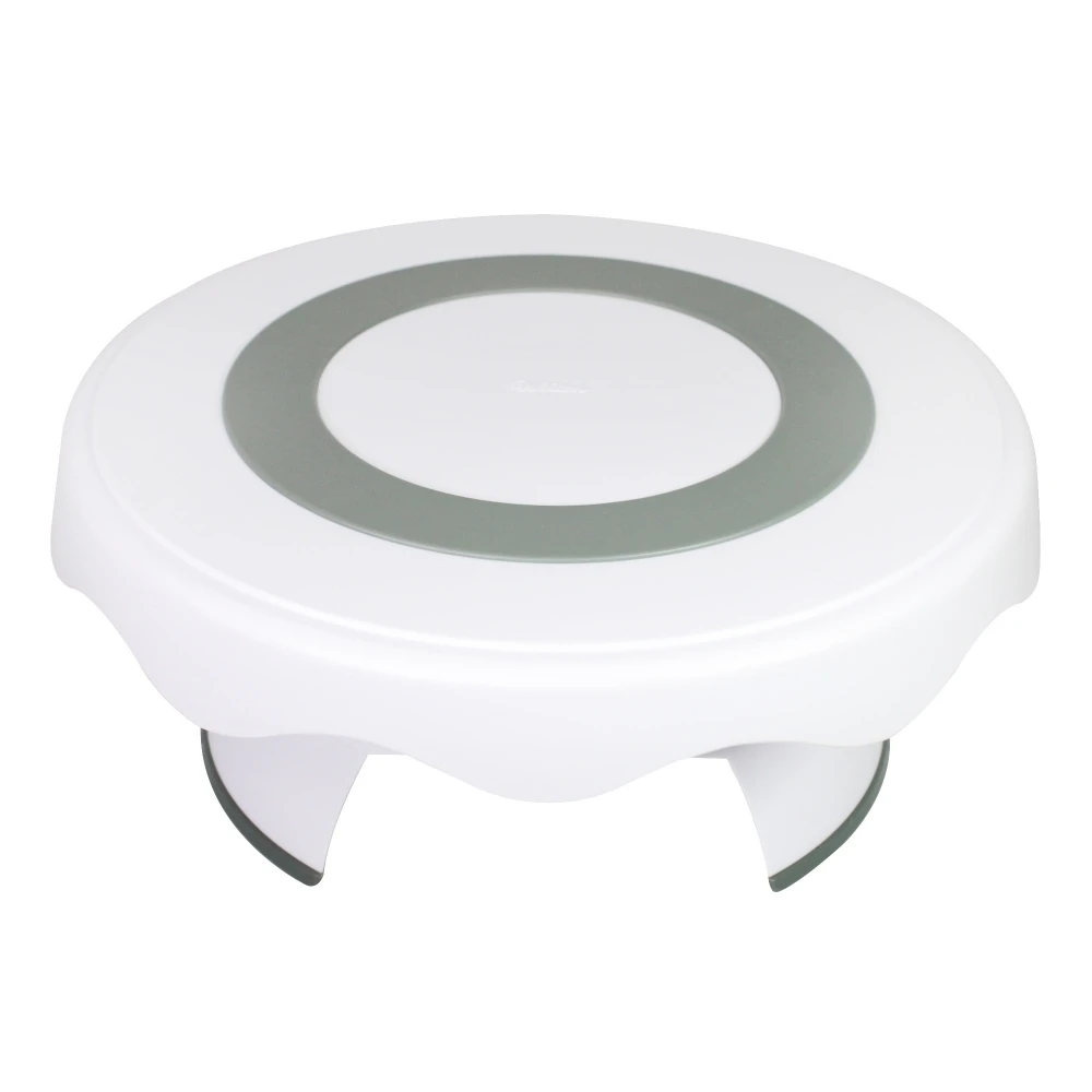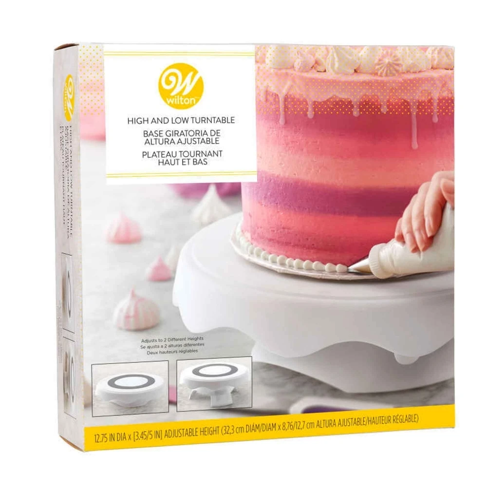 Give your cakes a lift with this Wilton turntable with adjustable legs. The turntable has scalloped edges that are not only decorative, but also gives the decorator a natural place to put their hand, making turning easier. The adjustable legs allow the decorator two heights and the easy-lock pull tab keeps the legs securely in place. The table also features a soft grip ring to keep the cake in place.